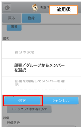 部署/グループ選択時などの、ピッカー部分に[選択]ボタンが追加されます。