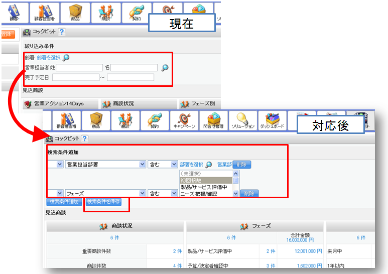 コックピット機能にて、商談機能等の絞り込みと同様に