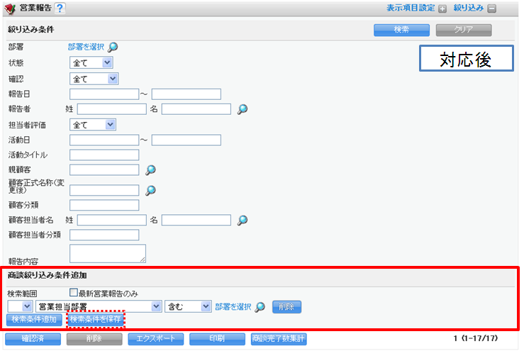 ・営業報告の絞り込みにて、営業報告に紐付く商談情報が検索可能となります。