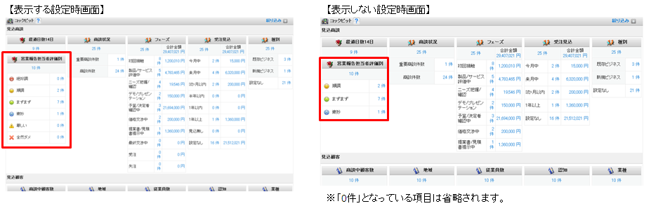 ・コックピット内の項目で、数値が0件である項目を画面から表示/非表示を設定することが可能です。