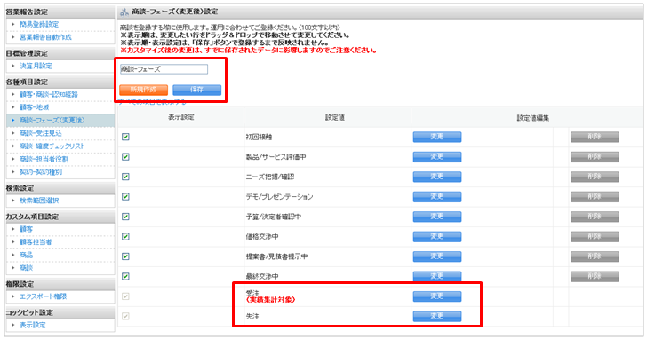 フェーズの設定値について、今までは「受注」「失注」項目の名称変更を不可としていましたが